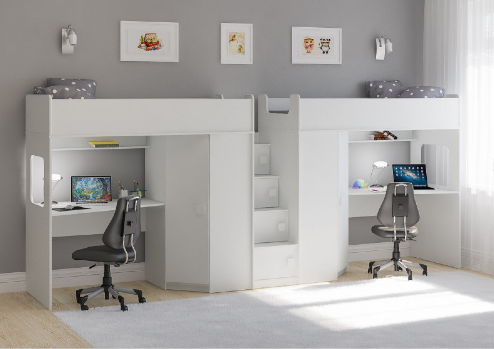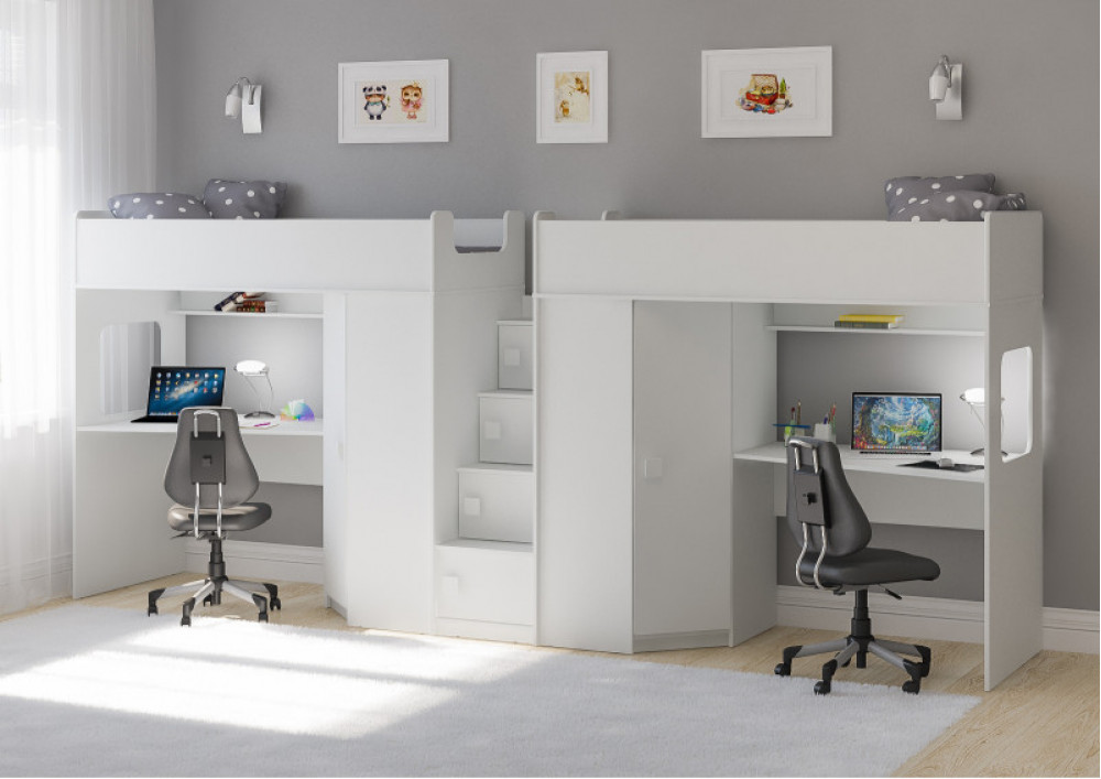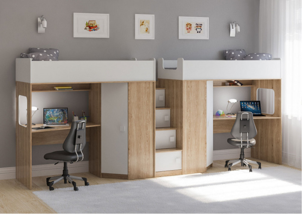 Под спальным местом для каждого ребенка располагается рабочее место с встроенным столом.