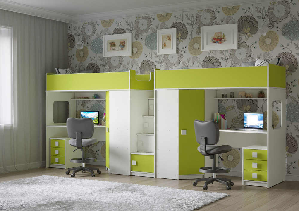 Под спальным местом для каждого ребенка располагается рабочее место с встроенным столом и тумбой.