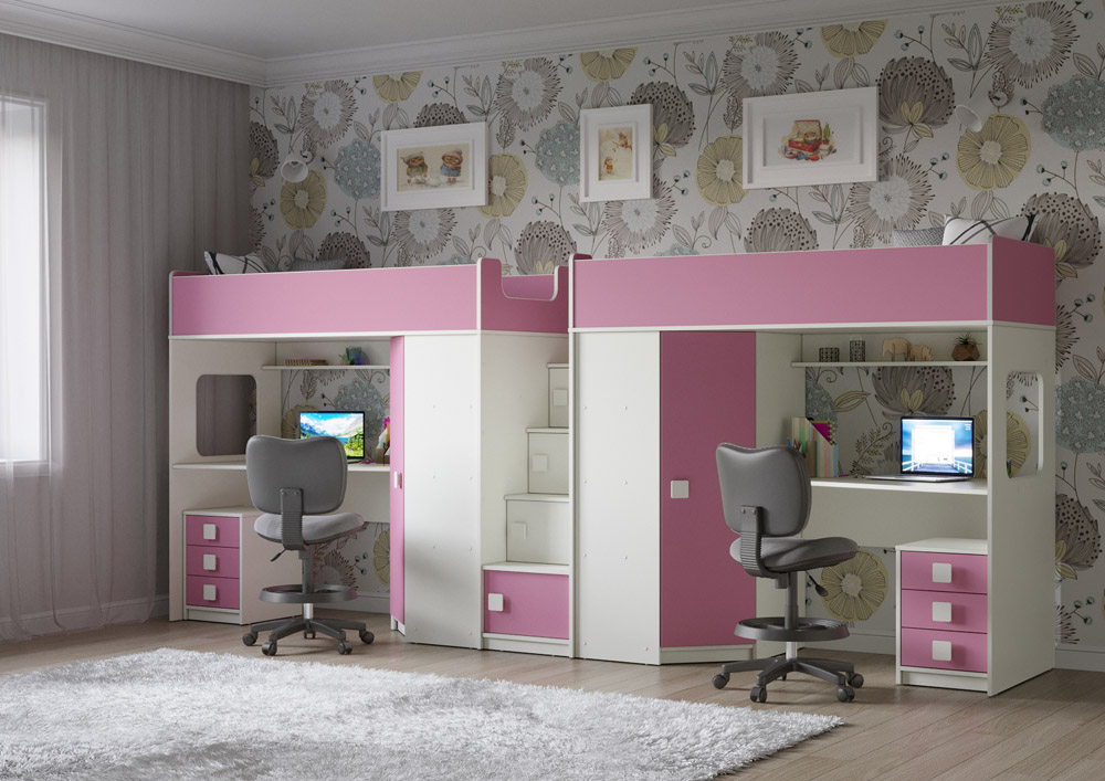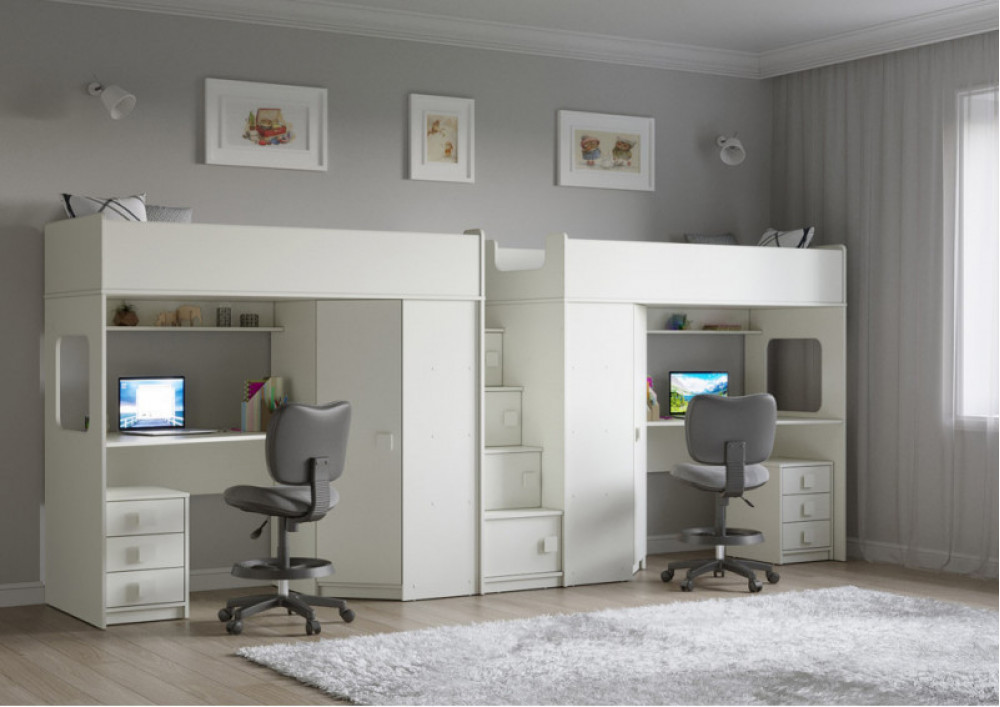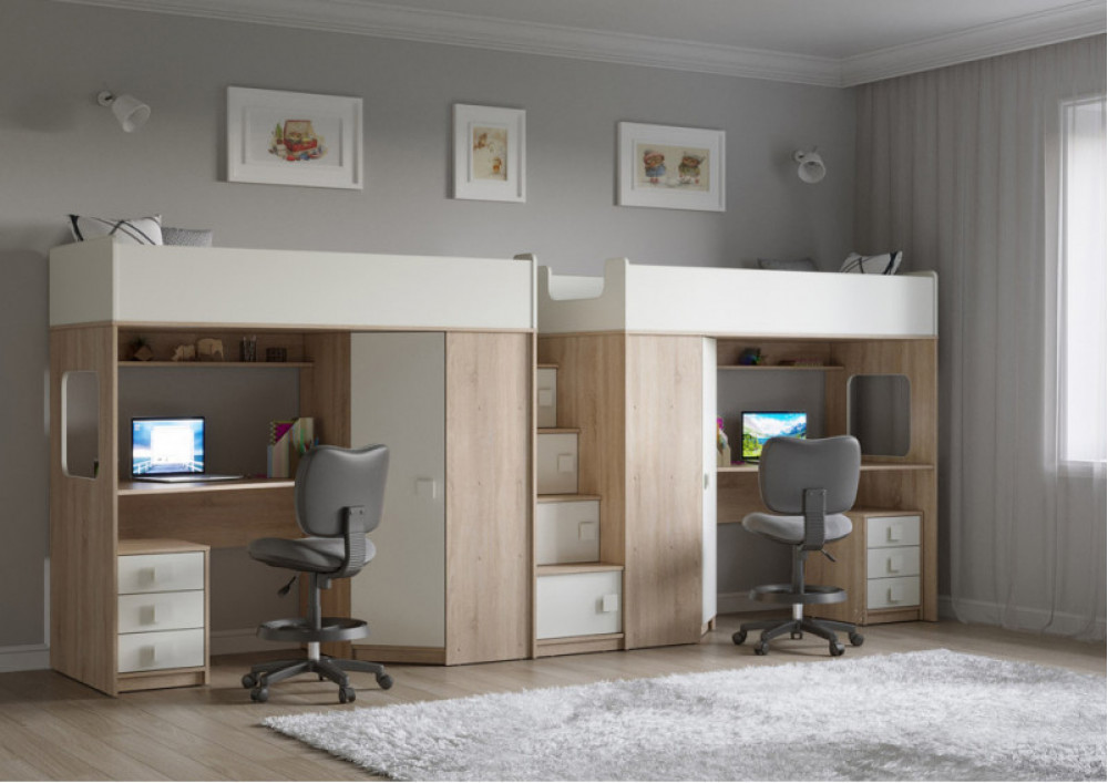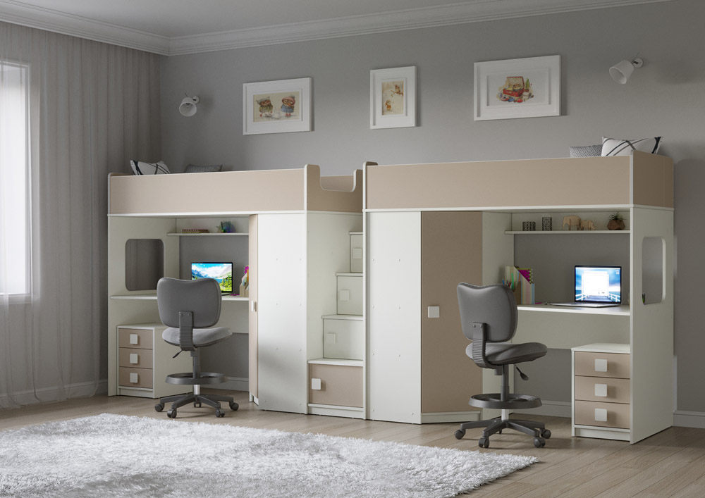 Две кровати, два шкафа, две рабочих зоны с тумбами – одна лестница. Идеальный вариант для двоих детей!