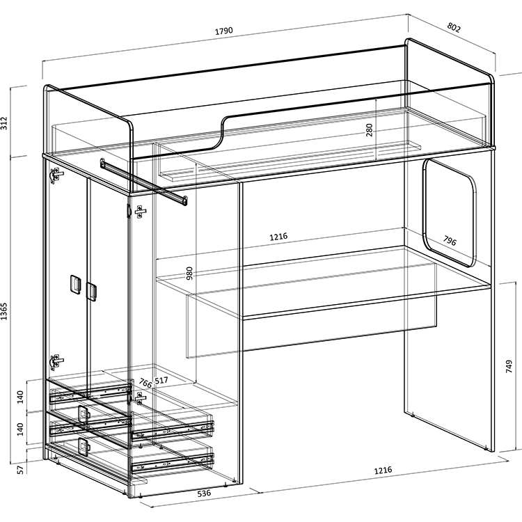 Высота кровати чердака всего 1677 мм.