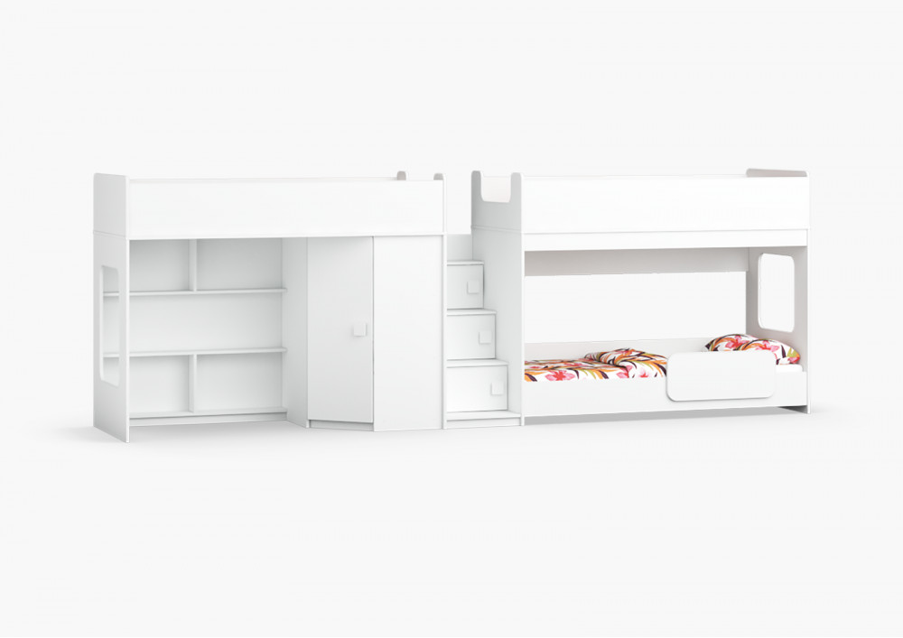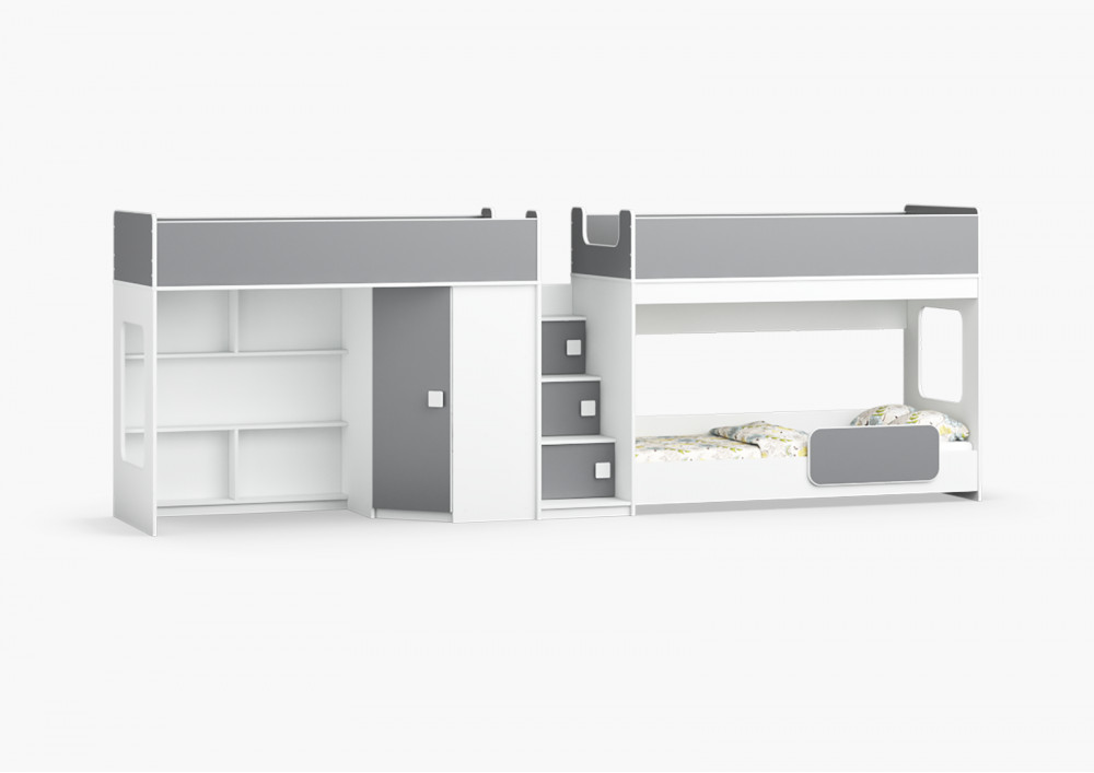 Трехъярусная кровать Легенда 43.2.5 - решение с угловым шкафом и игровой зоной для троих детей.